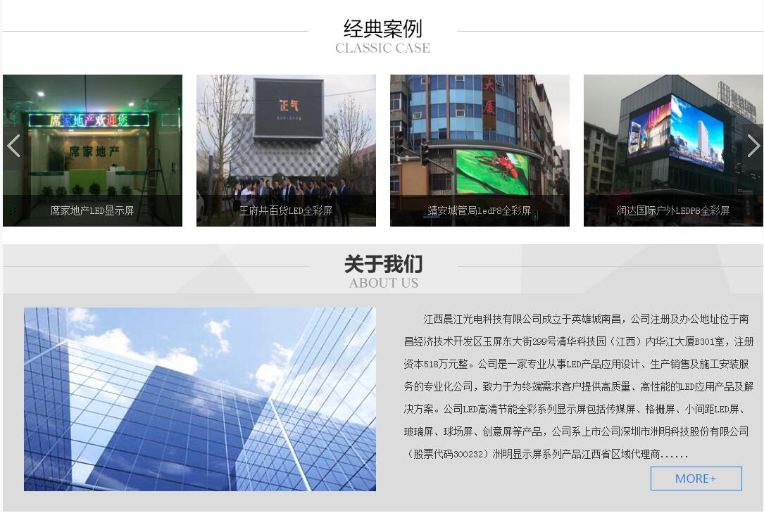 江西晨江光電科技有限公司成立于英雄城南昌,公司注冊及辦公地址位于南昌經(jīng)濟技術(shù)開發(fā)區(qū)玉屏東大街299號清華科技園(江西)內(nèi)華江大廈B301室,注冊資本518萬元整。公司是一家專業(yè)從事LED產(chǎn)品應(yīng)用設(shè)計、生產(chǎn)銷售及施工安裝服務(wù)的專業(yè)化公司,致力于為終端需求客戶提供高質(zhì)量、高性能的LED應(yīng)用產(chǎn)品及解決方案。公司LED高清節(jié)能全彩系列顯示屏包括傳媒屏、格柵屏、小間距LED屏、玻璃屏、球場屏、創(chuàng)意屏等產(chǎn)品,公司系上市公司深圳市洲明科技股份有限公司(股票代碼300232)洲明顯示屏系列產(chǎn)品江西省區(qū)域代理商。