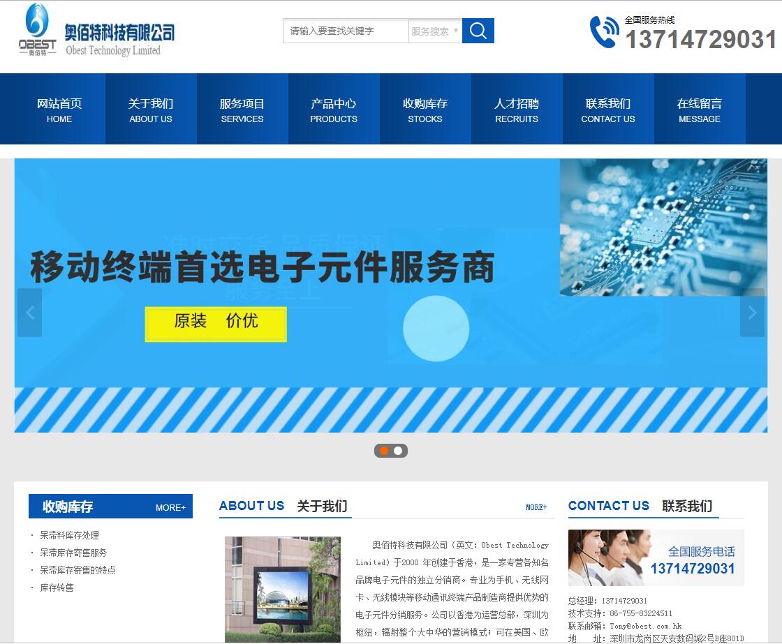 深圳奧佰特電子有限公司(英文:Obest Technology Limited)于2000 年創(chuàng)建于香港,是一家專營各知名品牌電子元件的獨立分銷商。專業(yè)為手機、無線網(wǎng)卡、無線模塊等移動通訊終端產(chǎn)品制造商提供優(yōu)勢的電子元件分銷服務。公司以香港為運營總部,深圳為樞紐,輻射整個大中華的營銷模式;可在美國、歐洲、香港用外幣結(jié)算,大陸人民幣含 17%增值稅交易。依靠極其專業(yè)的經(jīng)營團隊,以及“質(zhì)量第一、誠信為本、為客戶創(chuàng)造價值”的經(jīng)營宗旨;贏得了客戶的信賴;已成為眾多知名手機品牌商、方案商、無線通訊領(lǐng)域的OEM 、ODM、EMS代工廠首選元件供貨商、呆滯物料處理合作商。 公司產(chǎn)品涵蓋集成電路、液晶屏、接插件、二三極管、晶振等電子元件以及各類無線模塊。產(chǎn)品主要應用于移動電話、平板電腦、無線通訊模塊以及各類手持設(shè)備。我們在香港和深圳均設(shè)有倉庫,存有大量的各類緊急緊缺電子元件現(xiàn)貨。同時,擁有強大的采購網(wǎng)絡,在全球超100 家半導體廠家及其授權(quán)經(jīng)銷商、以及1000家電子設(shè)備廠商的庫存供應。我們?yōu)榭蛻籼峁┑统杀救轿坏囊徽臼讲少彿?,呆滯物料的回收或寄售,緊急停產(chǎn)難買器件的搜尋及供應服務。