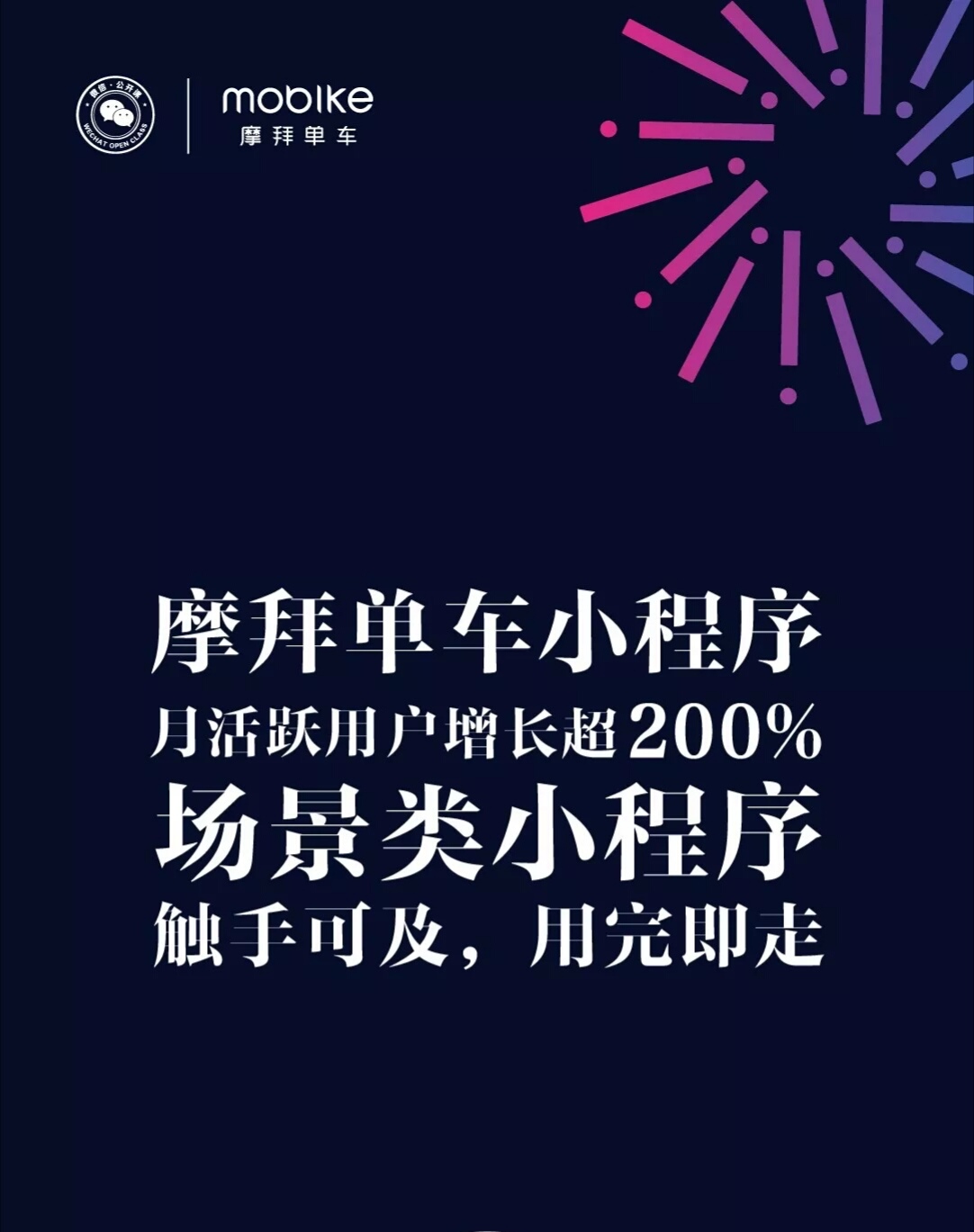 摩拜將小程序的各種能力作為企業(yè)運(yùn)營(yíng)的利器。掃一掃、紅包、立減金一個(gè)也不能少。在摩拜全面入駐微信之后,月活躍用戶量環(huán)比增長(zhǎng)超200%,每日注冊(cè)用戶超過(guò)50%來(lái)自小程序。