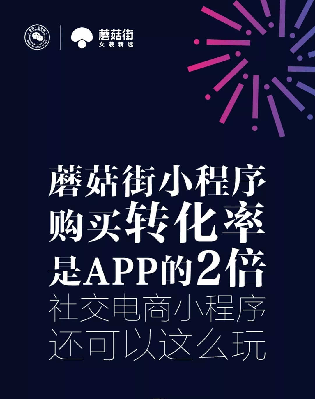 蘑菇街在小程序上大量使用優(yōu)惠券、立減金刺激用戶轉(zhuǎn)化和社交傳播。加上“直播”、“拼團(tuán)”,形成小程序“三駕馬車”,一個(gè)半月,新客數(shù)量就突破300萬(wàn),購(gòu)買轉(zhuǎn)化率是APP的2倍。
