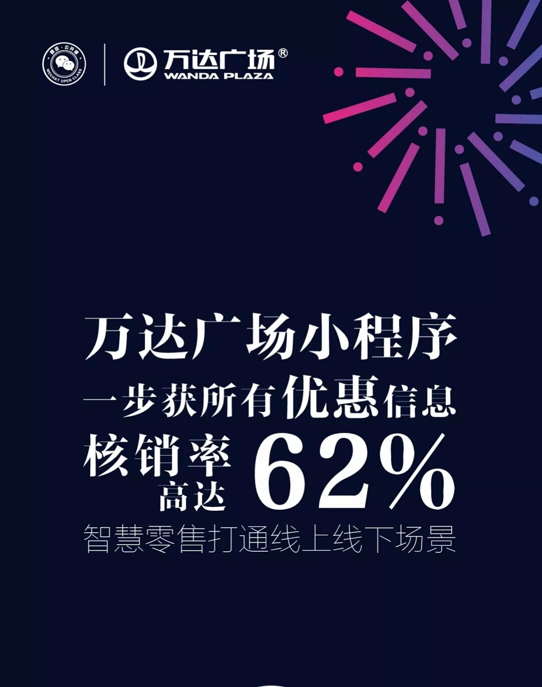 萬(wàn)達(dá)廣場(chǎng)在全國(guó)206個(gè)萬(wàn)達(dá)購(gòu)物中心進(jìn)行了一場(chǎng)“小程序營(yíng)銷”試驗(yàn),將信息整合在一個(gè)小程序上,讓顧客只需一步就能獲取整個(gè)購(gòu)物中心的各種優(yōu)惠信息,還能實(shí)現(xiàn)智能停車、限時(shí)搶購(gòu),提升了用戶對(duì)優(yōu)惠券的使用率,核銷率高達(dá)62%,這不僅節(jié)省了商鋪的宣傳成本,也幫助購(gòu)物中心進(jìn)行了智慧化管理。