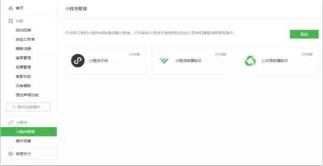 管理者可通過:公眾號(hào)管理后臺(tái)-小程序-小程序管理,繼續(xù)添加關(guān)聯(lián)小程序。