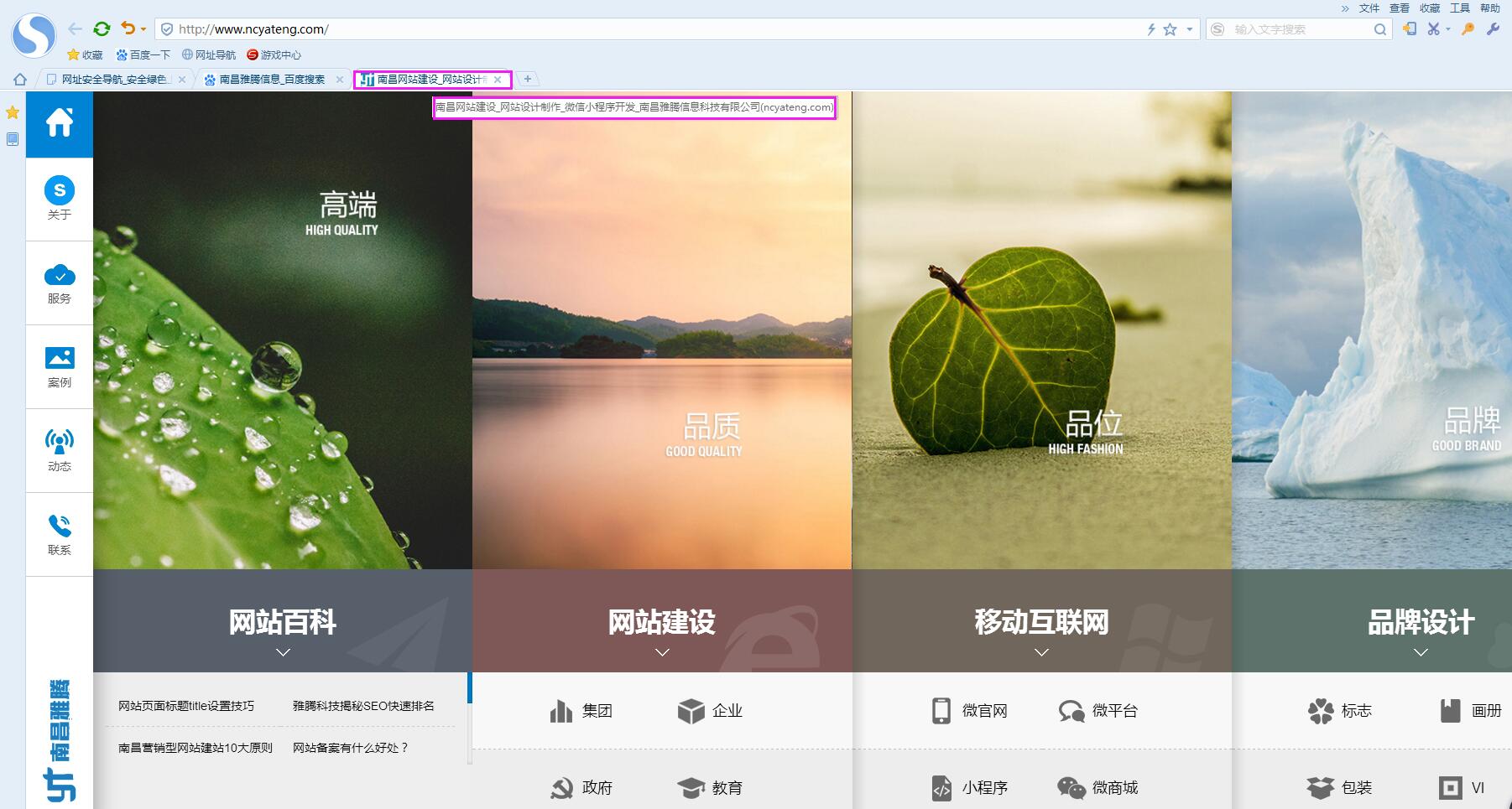 我們之前有看到有些企業(yè)的網(wǎng)站連標(biāo)題都沒有,當(dāng)時(shí)特別難以理解是什么樣的程序員寫的網(wǎng)站程序竟然網(wǎng)站沒有標(biāo)題,這樣的網(wǎng)站怎么被搜索引擎收錄?以后怎么做SEO優(yōu)化推廣呢?作為南昌網(wǎng)站建設(shè)專業(yè)的公司,我們深知一個(gè)網(wǎng)站的標(biāo)題、網(wǎng)頁的標(biāo)題對于一個(gè)網(wǎng)站而言是多么的至關(guān)重要。